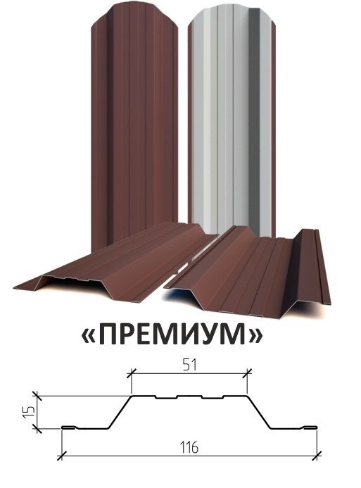 товар месяца Металлический штакетник Премиум, ширина 116 мм (завальцованные края) от 60 руб. пог.м Менеджеры нашей компании всегда готовы подробно проконсультировать. Если у вас возникли вопросы по ценам, наличию товара, порядке установки или доставке, звоните по телефону 263-08-43 или нажмите: Менеджеры нашей компании всегда готовы подробно проконсультировать. Если у вас возникли вопросы по ценам, наличию товара, порядке установки или доставке, звоните по телефону 263-08-43 или нажмите: Описание Описание Металлический штакетник ПРЕМИУМ- это усиленный штакетник с 16 ребрами жесткости.Безопасные завальцованные края. Вид завершения прямой, закругленный, трапеция. При ширине штакетника 116 мм на 1 м.п. требуется 6-7 шт. планок. Звоните 263-08-43